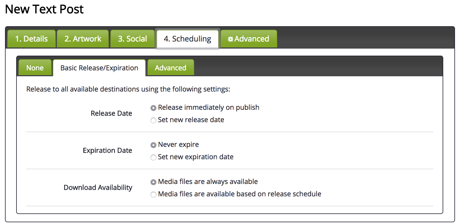 After episode details have been added, the episode can be scheduled for when it is released or expired. Click on Scheduling Release/Expiration to open up the scheduling options. For details on scheduling, checkout this tutorial.