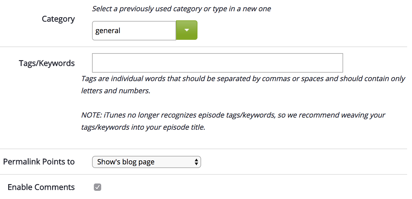 Setting a category for an episode will allow organization of content on the Libsyn Podcast Page, or embedding a media player specific to that category (this does not affect your RSS feed). Details on managing categories are outlined here.